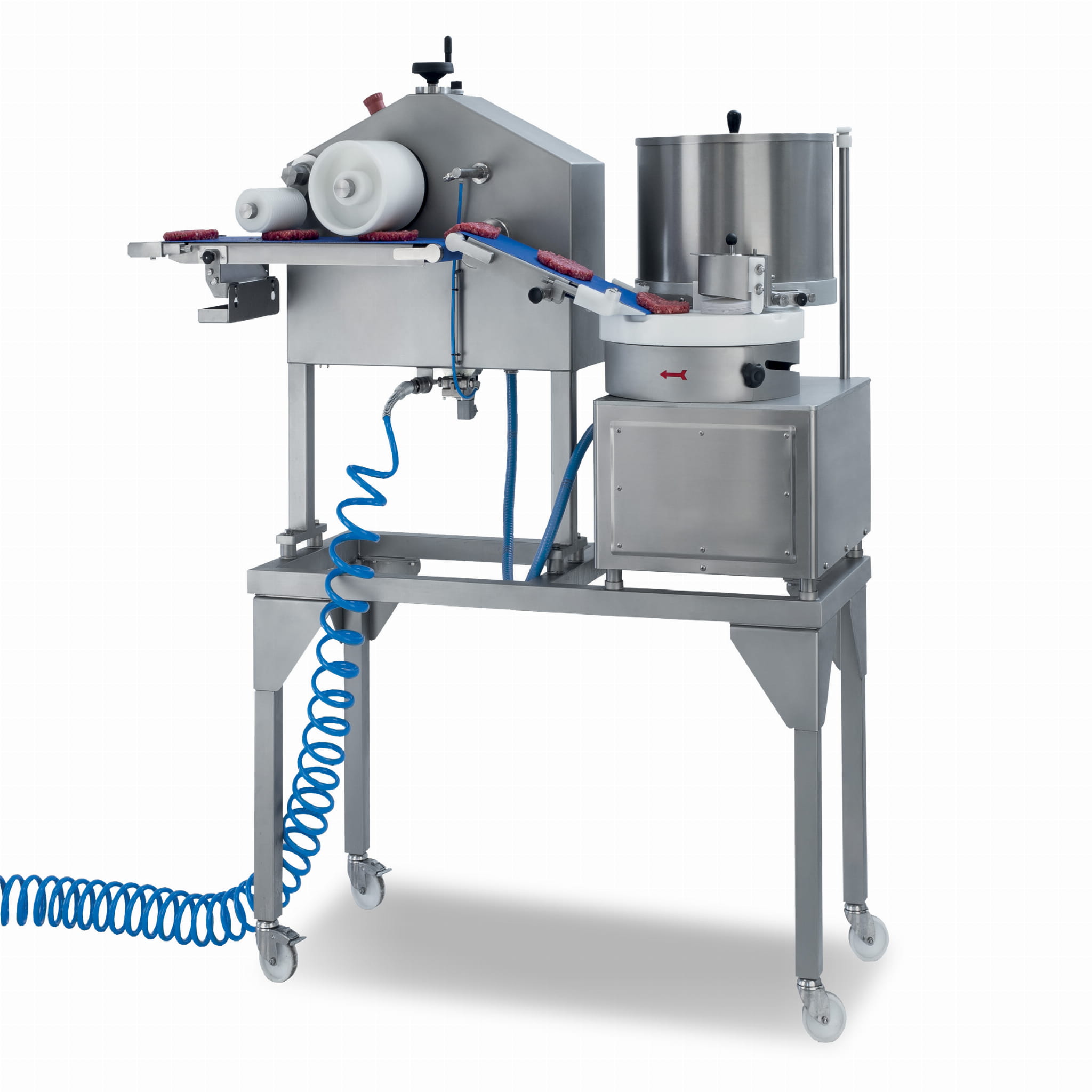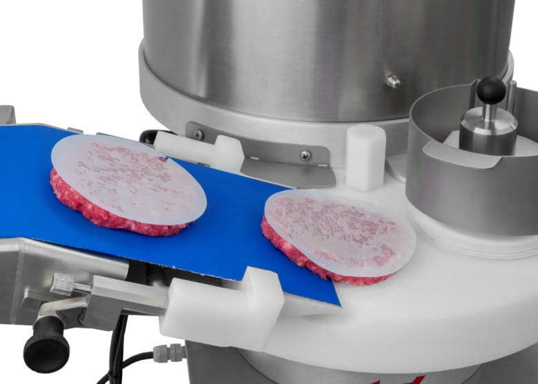 - Urządzenie w zestawie z taśmą przenośnikową oraz cylindrem formującym (prosimy o wybór średnicy burgera przy złożeniu zamówienia: 32, 40, 65, 90, 100, 115 lub 130 mm)