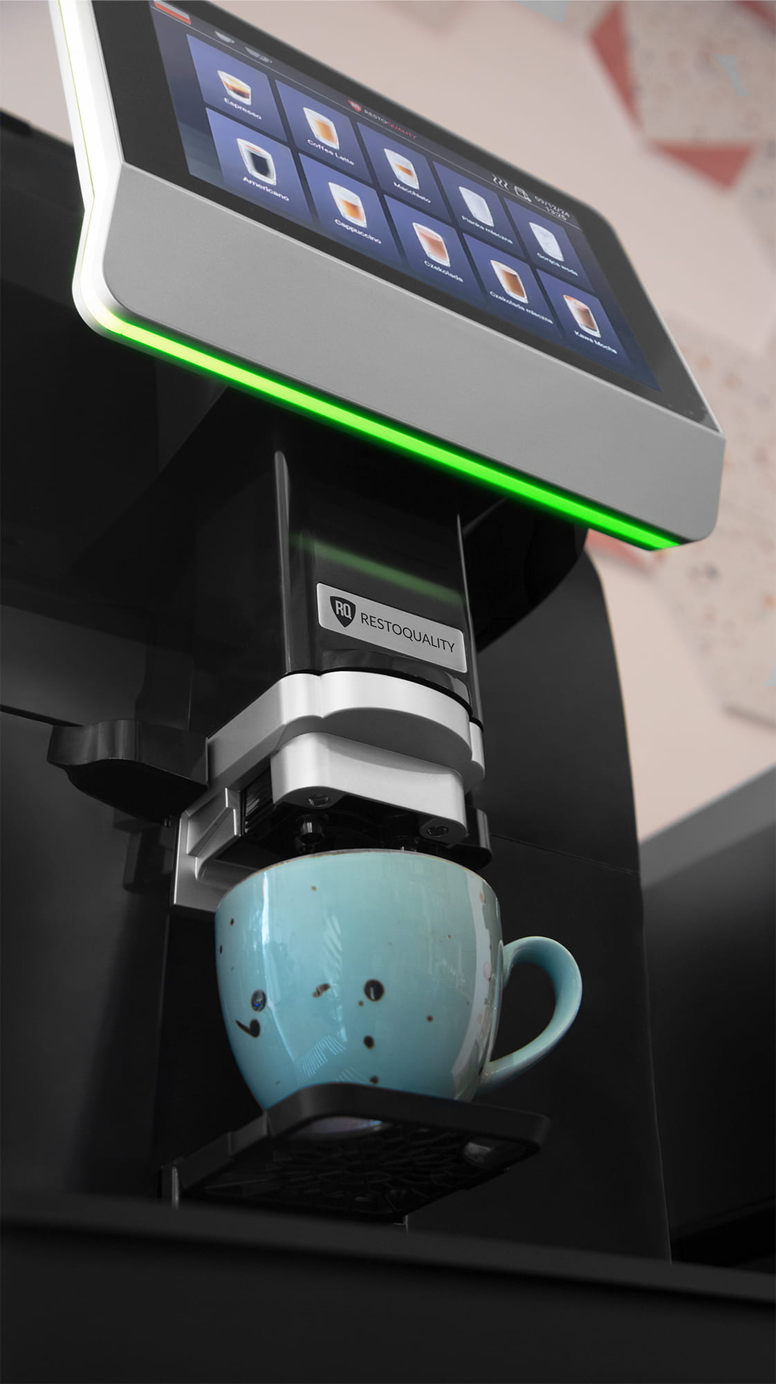 - Wyposażony w duży dotykowy 10,1-calowy wyświetlacz o wysokiej rozdzielczości z przejrzystym, prostym w obsłudze interfejsem w języku polskim oraz w wielu innych językach. Wzbogacony o trójkolorowe oświetlenie ambientowe wzdłuż krawędzi ekranu. Napoje w menu są przedstawione graficznie, co maksymalnie ułatwia obsługę ekspresu. Na wyświetlaczu możemy ustawić dowolną ilość kaw, które będą dostępne za jednym dotknięciem