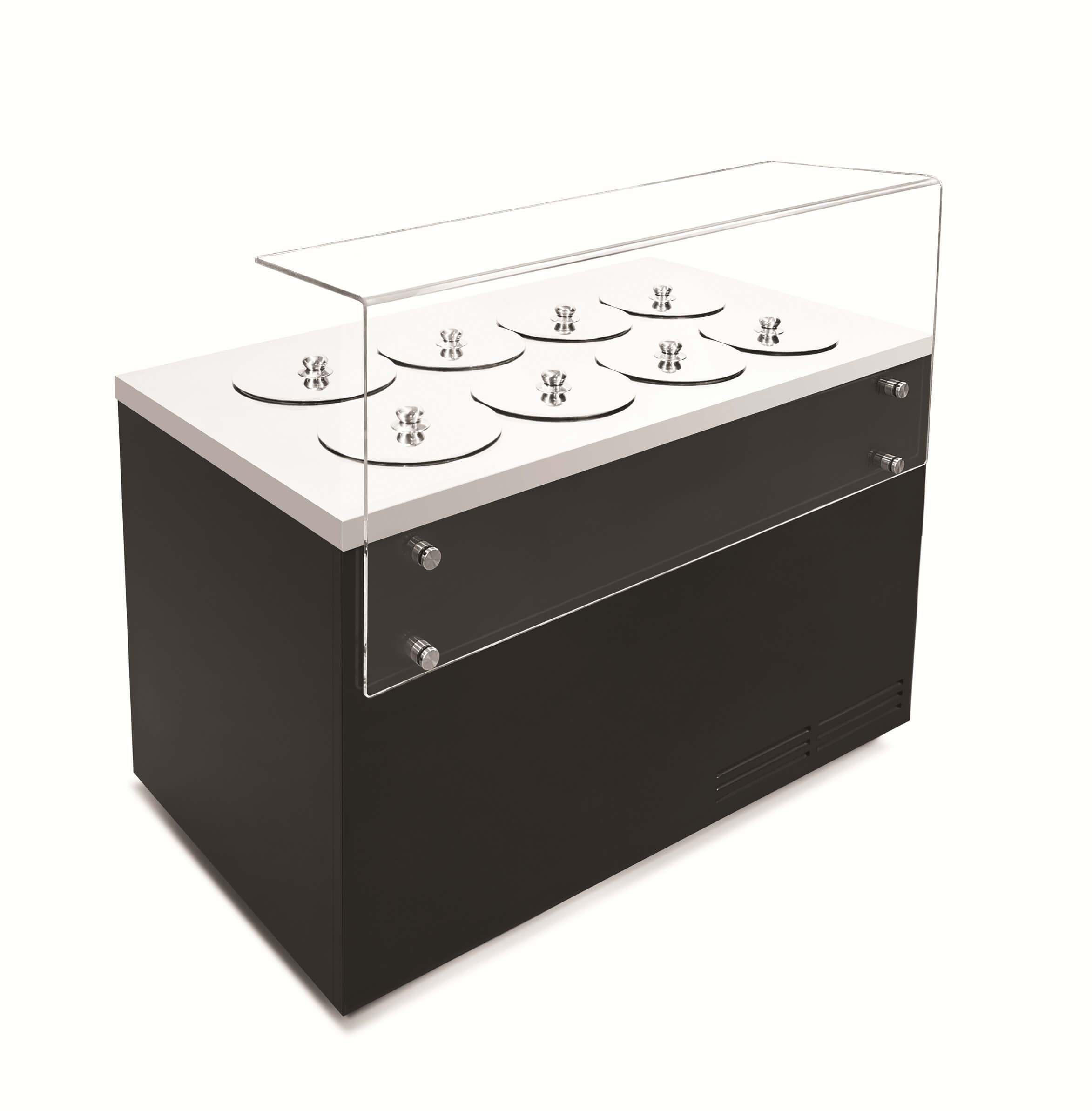 - Nadstawa szklana o specjalnie zaprojektowanej konstrukcji ze szkła hartowanego, gwarantującej maksymalną widoczność produktów - bez spoin, czy sitodruku - na specjalne zamówienie, za dopłatą
