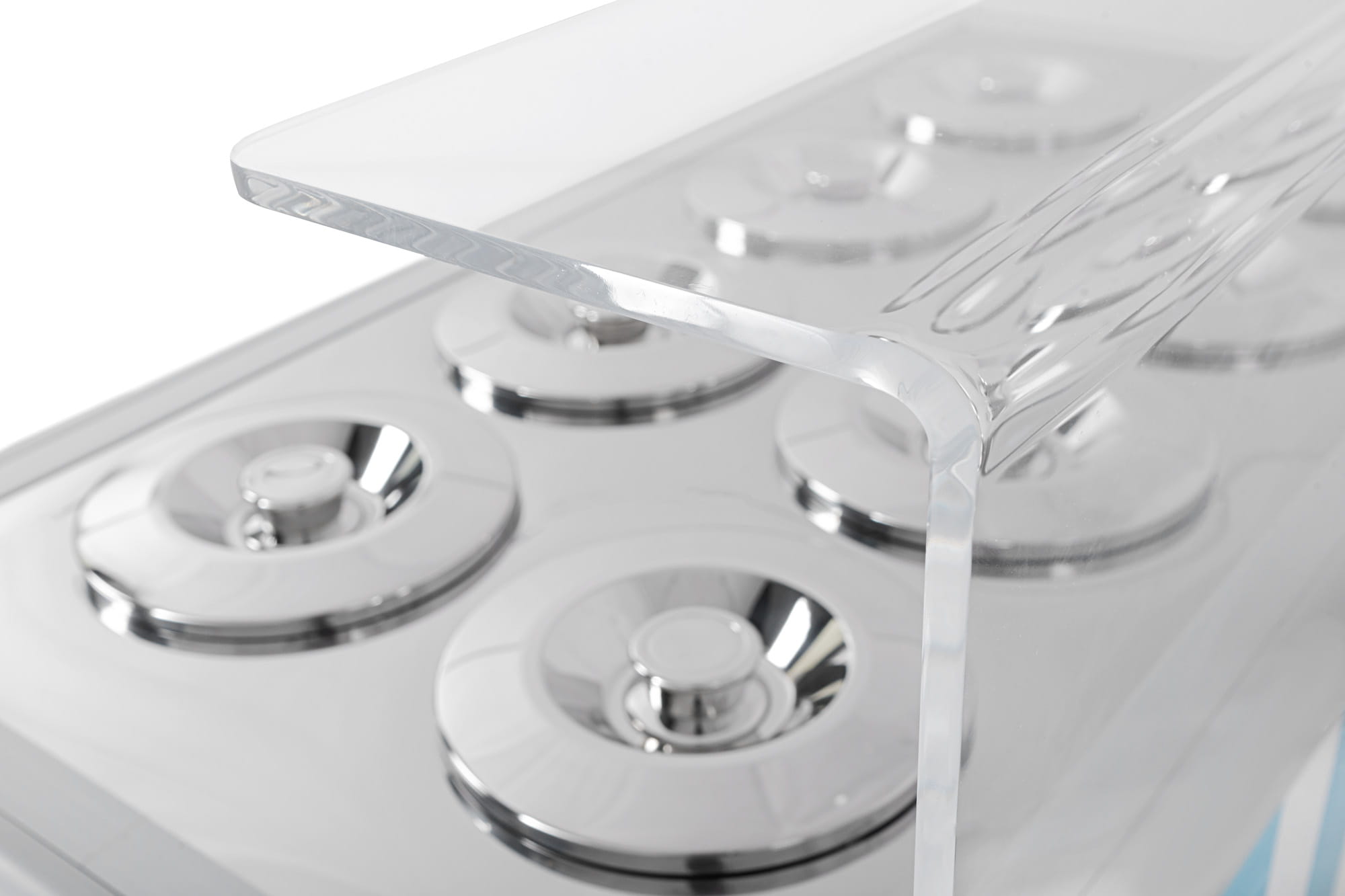 - Wysuwany blat roboczy z otworami pod pojemniki tubowe oraz pokrywkami ze stali nierdzewnej
