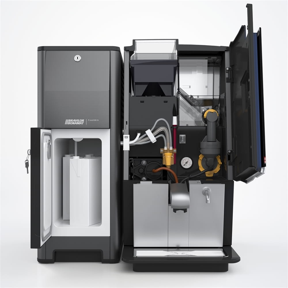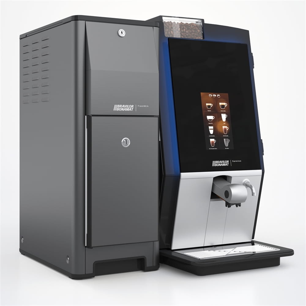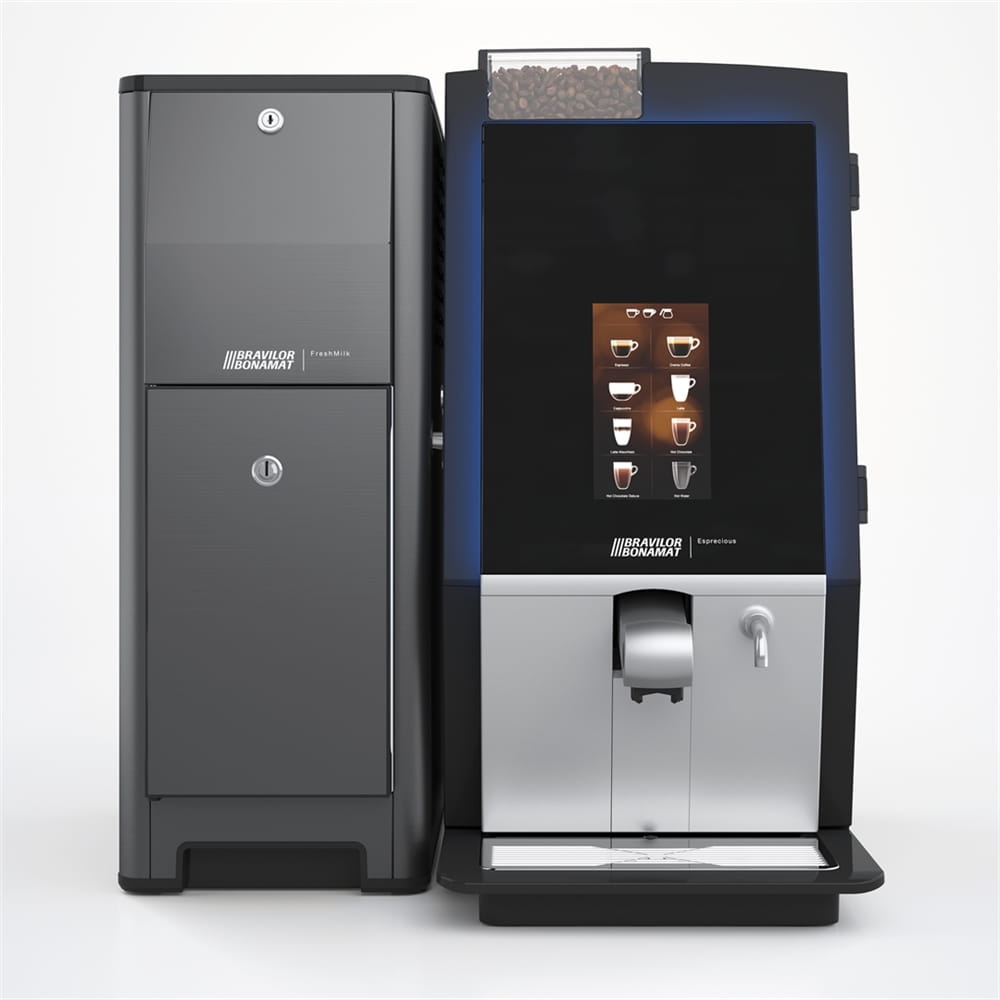 Bravilor Bonamat ESPRECIOUS 11L to automatyczny ekspres ciśnieniowy do kawy. Ekspres wyposażony jest w jeden młynek oraz dwa pojemniki. Jeden pojemnik przeznaczony jest na kawę ziarnistą, drugi zaś na czekoladę instant. Esprecious jest profesjonalnym ekspresem. Dzięki intuicyjnemu interfejsowi, łatwej obsłudze oraz dużej wydajności urządzenie to doskonale sprawdza się jako ekspres do dużego biura, ekspres do sali weselnej jak i ekspres do Hotelu. Dodatkowo do ESPRECIOUS 11L można bezpośrednio podłączyć moduł mleka „FreshMilk”, i serwować napoje ze świeżym mlekiem. Uwaga! Ekspres Esprecious 11L nie jest wyposażony w urządzenie „FreshMilk”. Należy je zamawiać oddzielnie.