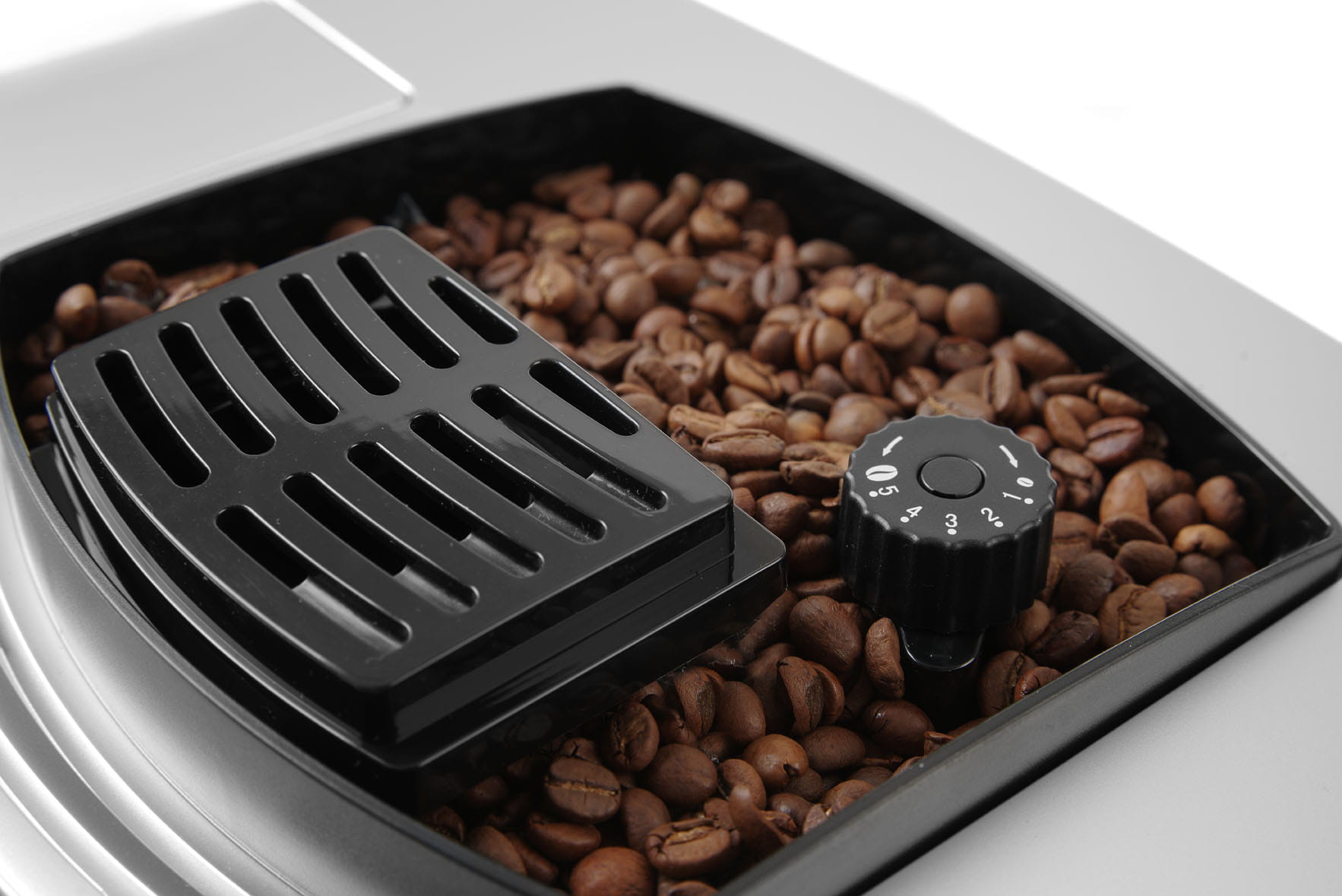 - Wbudowany młynek z regulacją stopnia mielenia kawy