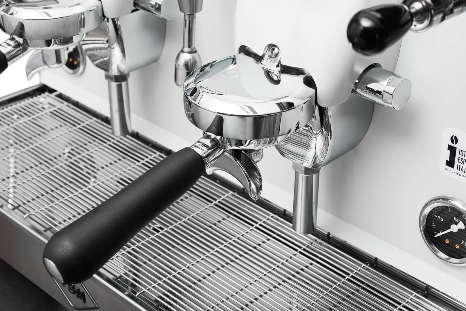 - Sterowane dyszą spieniania mleka oraz wylewką wody za pomocą ergonomicznych dźwigni, które zapewniają szybką obsługę ekspresu