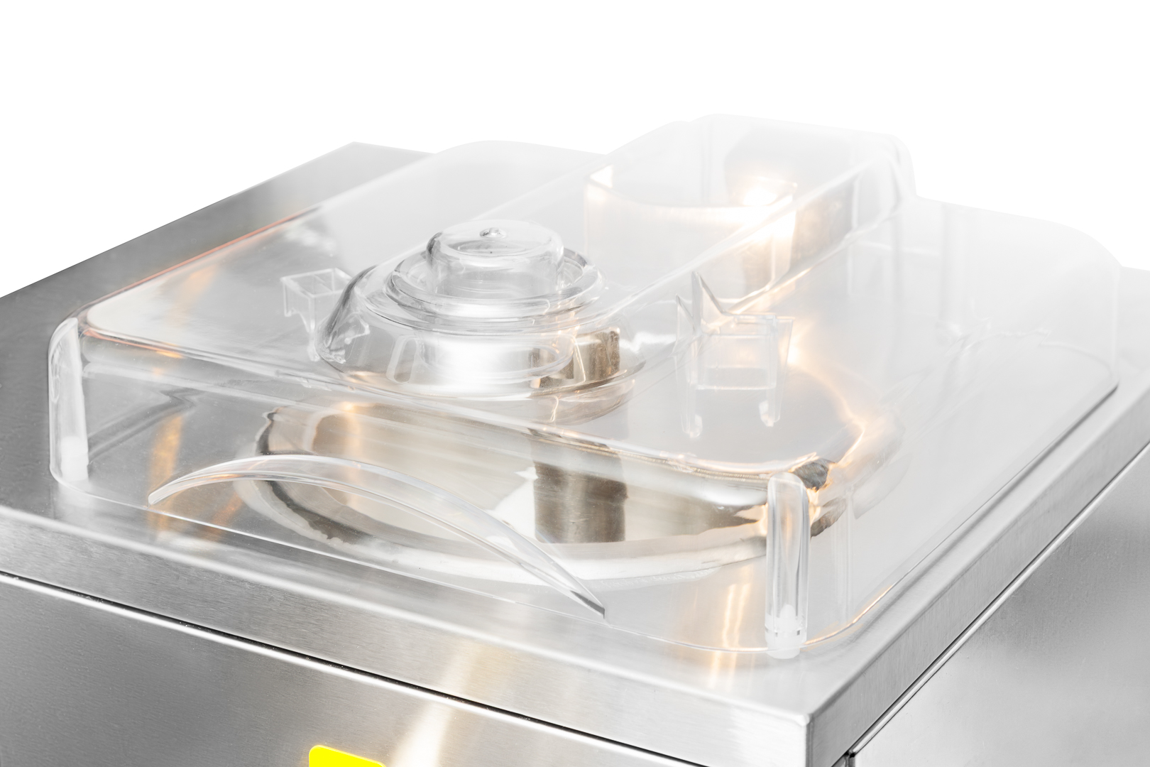 - Transparentna pokrywa z oświetleniem LED umożliwia stałą kontrolę procesu produkcji bez zbędnych przerw.