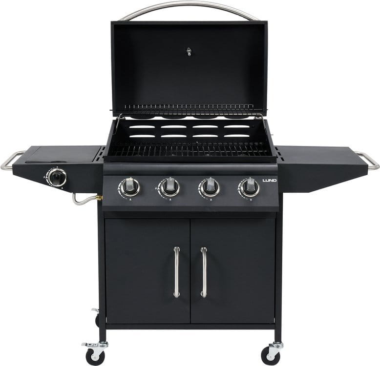 Profesjonalny grill gazowy 4+1 do przygotowywania potraw na świeżym powietrzu, z wygodną regulacją pozwalającą na idealne wypieczenie potraw. Wyposażony w 4 palniki główne i 1 boczny o łącznej mocy 16kW. Półki boczne oraz pojemna, zamykana szafka ułatwią przechowywanie przypraw i niezbędnych akcesoriów.