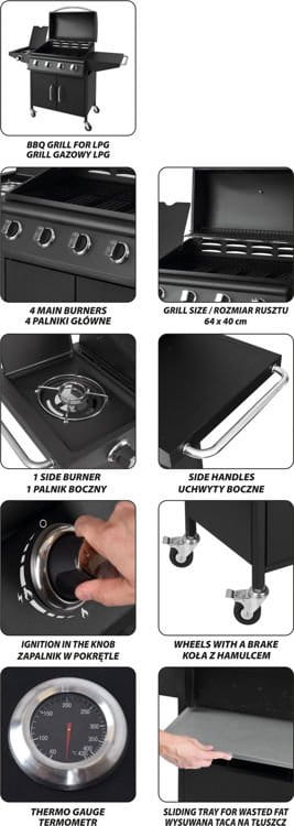 - KONTROLA TEMPERATURY - dzięki pokrętłom, pokrywie, kilku palnikom oraz termometrowi jesteś w stanie dopasować temperaturę do przyrządzanych mięs, warzyw i serów.