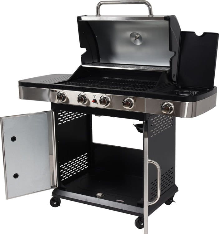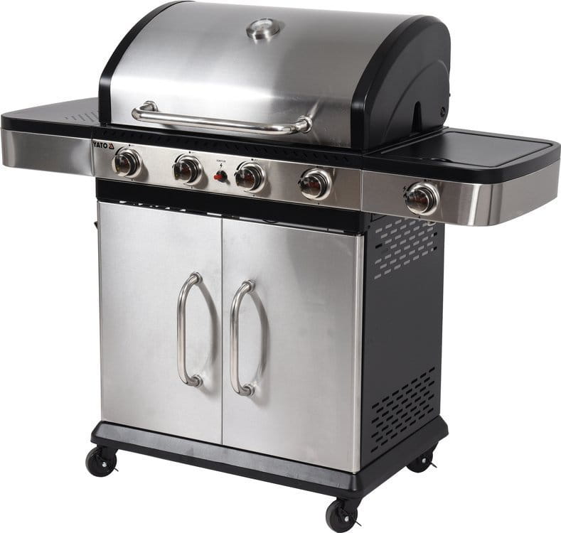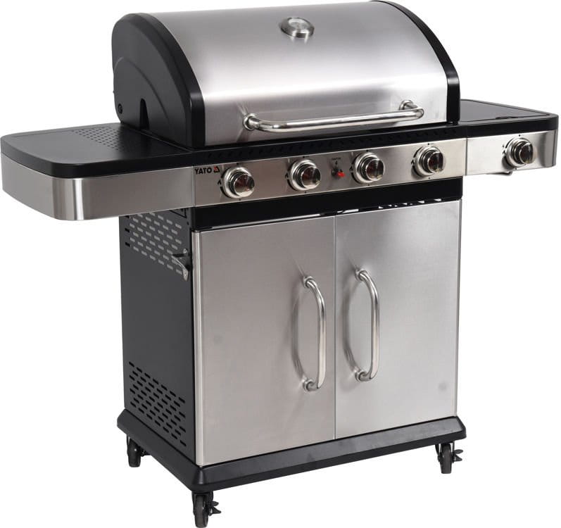Nowocześnie wyglądający grill gazowy 4+1 wykonany ze stali nierdzewnej, wyposażony w niezawodny, żeliwny ruszt. Półki boczne oraz pojemna, zamykana szafka ułatwią przechowywanie przypraw i niezbędnych akcesoriów. Palnik boczny o mocy 2,5kW umożliwi gotowanie i podgrzewanie potraw w garnku i na patelni.