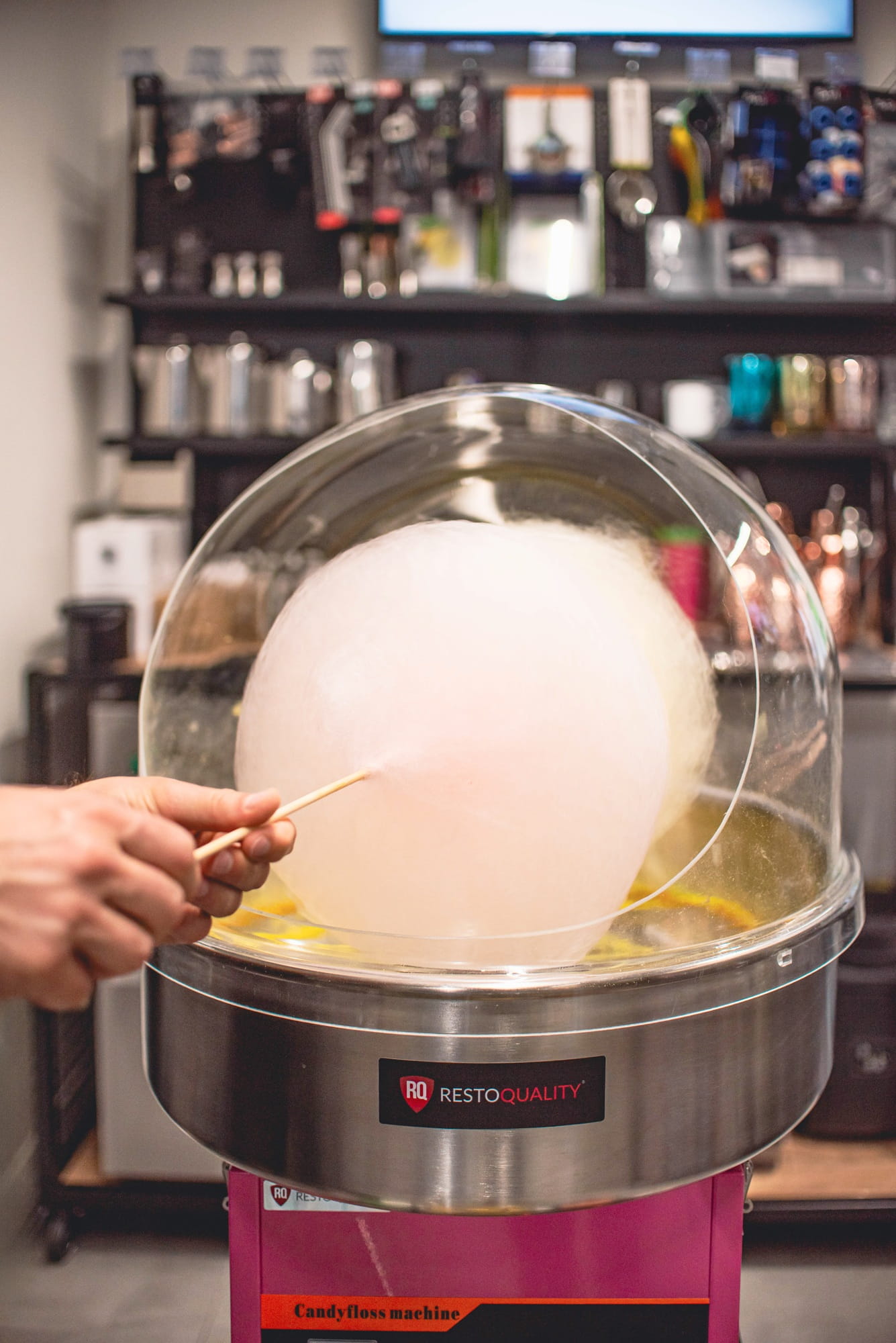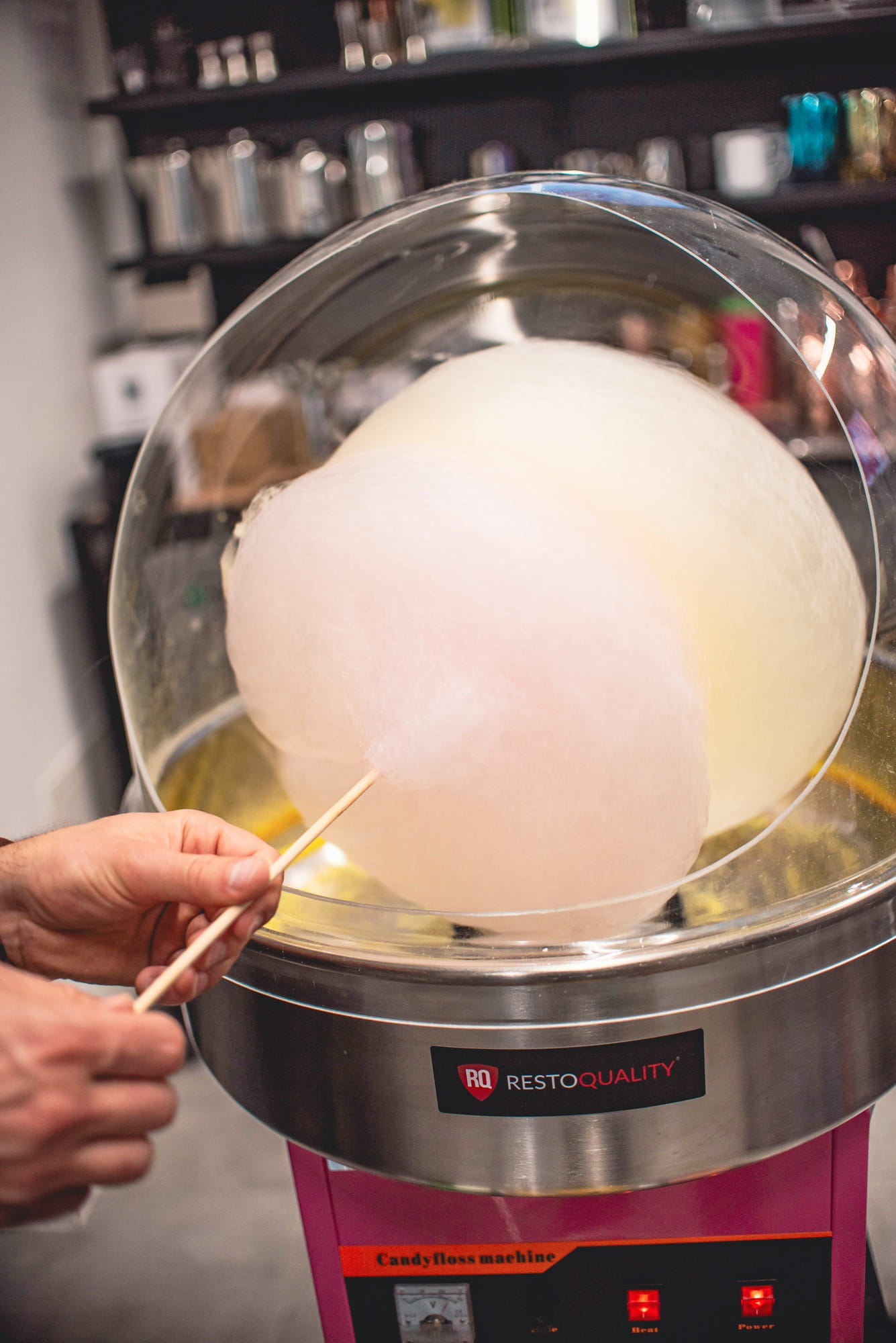 - Wystarczy włączyć urządzenie i ogrzewanie, wsypać porcję cukru, a maszyna rozpocznie produkcję waty cukrowej, gotową do zebrania na patyczek
