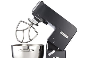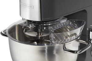 - Mocne końcówki ze stali nierdzewnej. Wytrzymały hak do ciasta, ubijak i trzepaczka mają osłony przeciwbryzgowe, które utrzymują składniki z dala od obszaru piasty.
