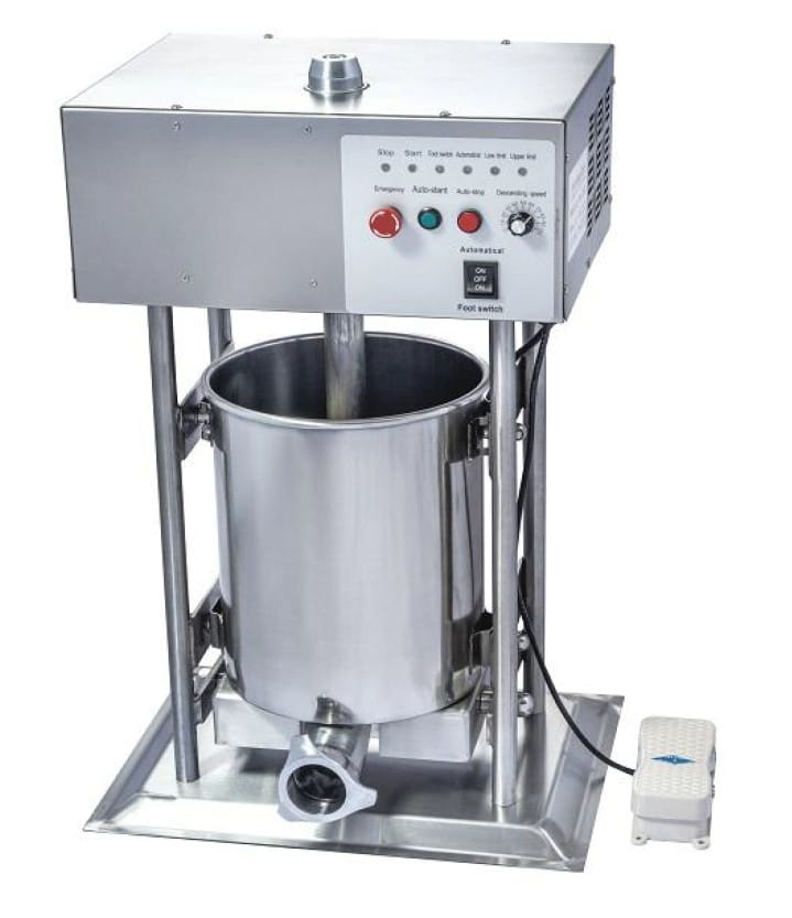 - Profesjonalna, pionowa nadziewarka elektryczna do kiełbas o pojemności 15 litrów wykonana w całości ze stali nierdzewnej przeznaczona dla restauracji oraz użytkowników indywidualnych przyrządzających własne wyroby