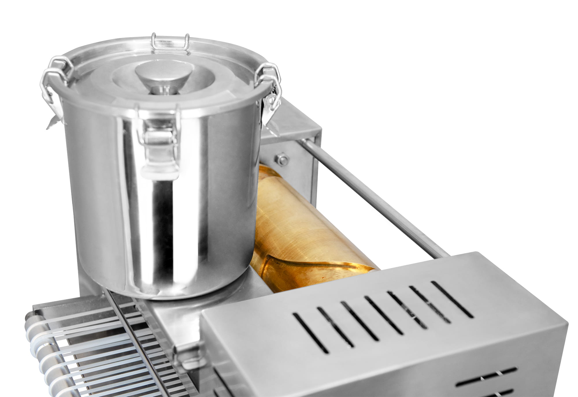 w produkcji krokietów, szkołach i przedszkolach, ect - Ciasto na naleśniki wlewamy do pojemnika na górze urządzenia i po odblokowaniu zaworu ciasto wylewa się na tackę podawczą.