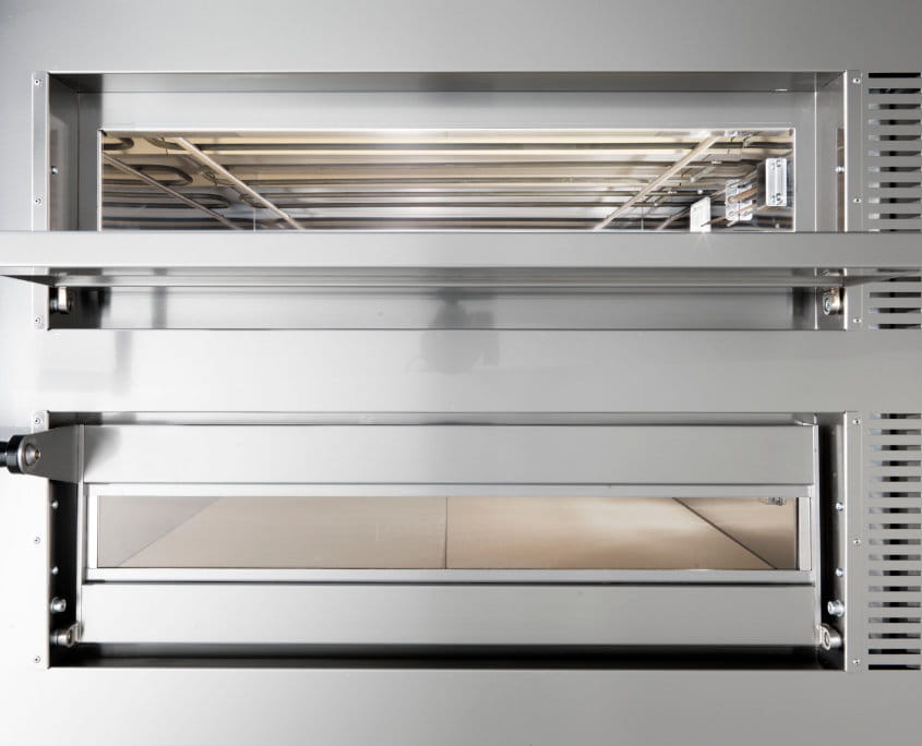 - Komora wyłożona jest płytą z kordierytu, który bardzo dobrze absorbuje i równomiernie rozprowadza ciepło oraz zapewnia doskonałą cyrkulację powietrza pod pizzą. Dzięki temu ciasto jest idealnie wypieczone