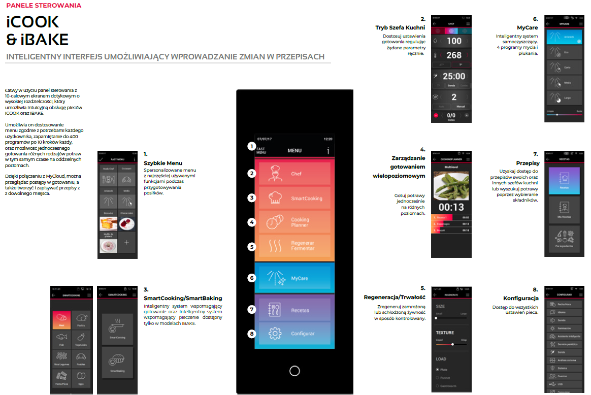 - MySmartCooking - inteligentny system gotowania. Wybierz produkt, rodzaj obróbki , dostosuj wielkość, stopień przyrumienienia i ustawienia punktowe, a piec sam obliczy parametry, aby uzyskać doskonały rezultat