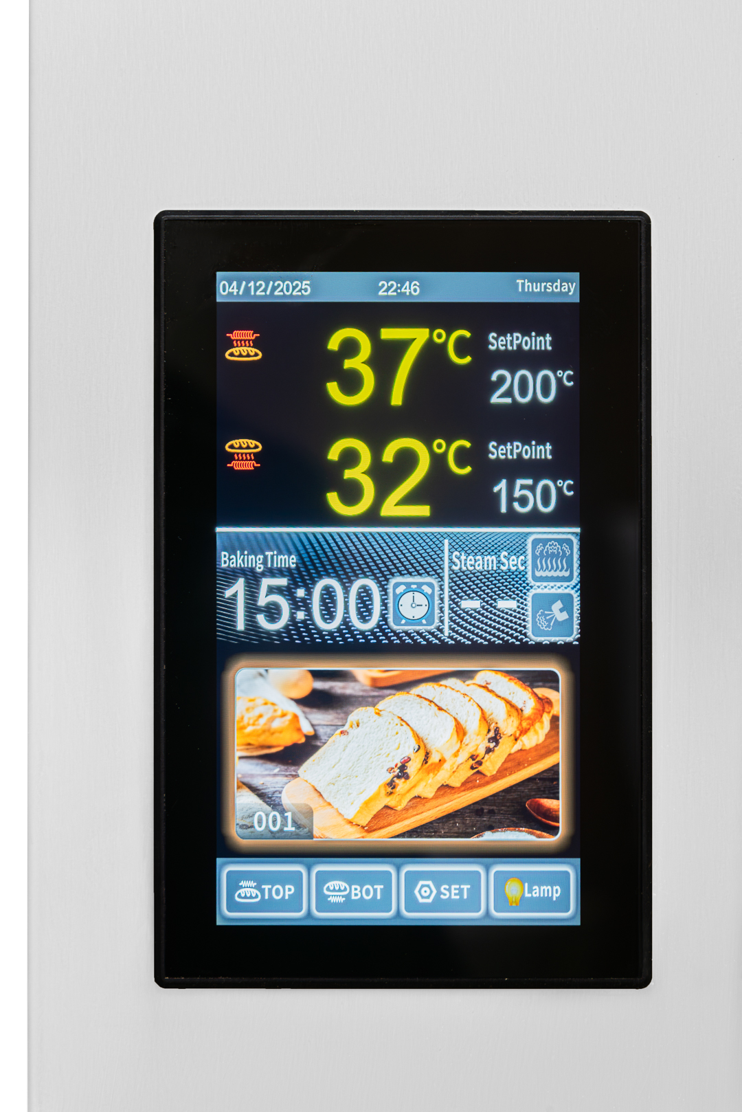 - Zaawansowany, dotykowy panel sterowania LED zapewnia intuicyjną obsługę i pozwala na precyzyjną regulację kluczowych parametrów, takich jak niezależna temperatura dla górnej i dolnej grzałki, czas pieczenia, dedykowane menu wypieków, oświetlenie komory, funkcje pary oraz harmonogram zaplanowanego uruchamiania i zatrzymywania urządzenia.