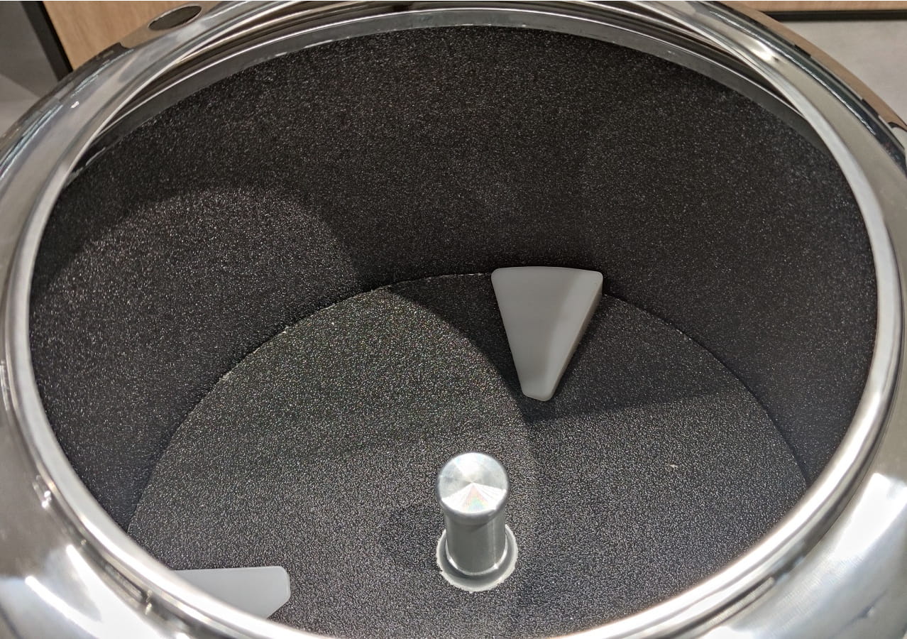 Szybszy proces obierania – urządzenie wyposażono nie tylko w dolny dysk ścierny, ale także w wymienne maty ścierne umieszczone na bocznych ściankach. Dzięki temu proces obierania przebiega znacznie szybciej i efektywniej niż w modelach konkurencyjnych.