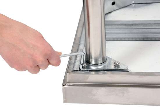 - Nogi stołu wykonane z okrągłych profili posiadają regulację wysokości w zakresie +/-15mm, co pozwala na wypoziomowanie stołu nawet na nierównych podłożach. Ponadto posiadają podkładki plastikowe, które zabezpieczają podłogę przed zarysowaniem