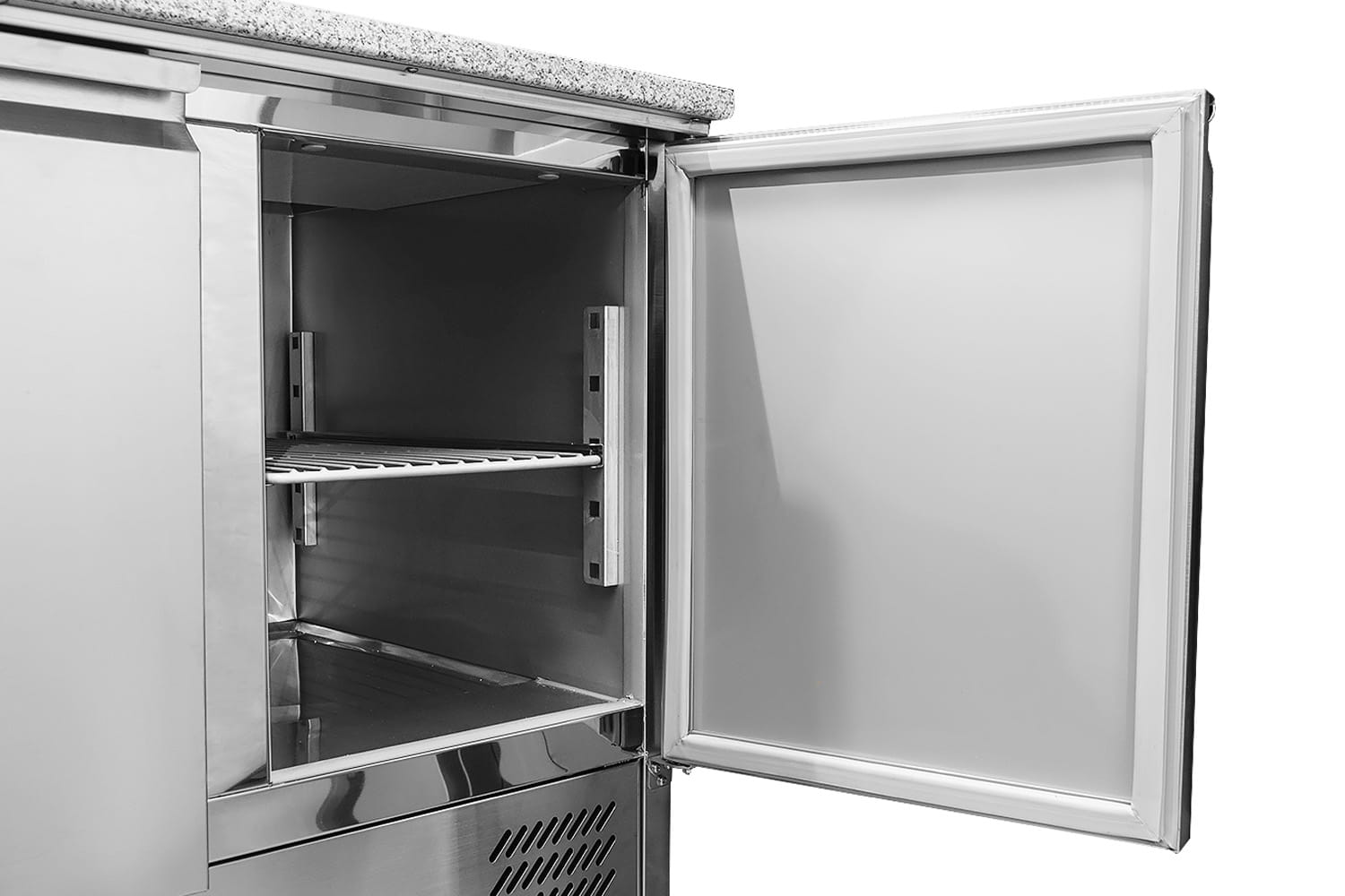 Stół chłodniczy do pizzy idealnie nadaje się do małych pizzerii gdzie nie ma miejsca na duży stół do pizzy z nadstawką. Posiada blat granitowy na którym można z łatwością przygotować pizzę o średnicy do 50 cm. Stół posiada specjalne wycięcie na pojemniki GN1/6 o głębokości 10 cm na półprodukty takie jak szynka, pomidory, salami, pieczarki itp. Na stole możemy przygotować pizze, kanapki, tortille i wiele innych produktów. Dolna komora jest wyposażona standardowo w jedną przestawką półkę o standardzie GN1/1 na każde drzwi.