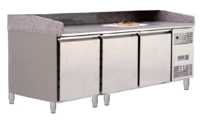 3-drzwiowy stół chłodniczy do pizzy z granitowym blatem, wykonany ze stali nierdzewnej, przystosowany do blach piekarniczych. Urządzenie doskonale nadaje się do różnego rodzaju punktów gastronomicznych tj. restauracje, pizzerie, bary, fast-food’y itp.