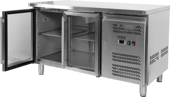 - Stół do przechowywania żywości z bocznym agregatem oraz drzwiami z podwójnego, hartowanego szkła