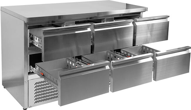 - Wygodny stół z 6 szufladami do przechowywania żywności i dolnym agregatem
