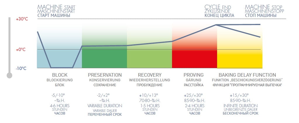 - Umożliwia precyzyjne zarządzaniem cyklem wstrzymania wzrostu, przechowywania, regenerowania i rozrostu ciasta, kontrolowanie temperatury, poziomu wilgotności, czasu trwania poszczególnych cykli