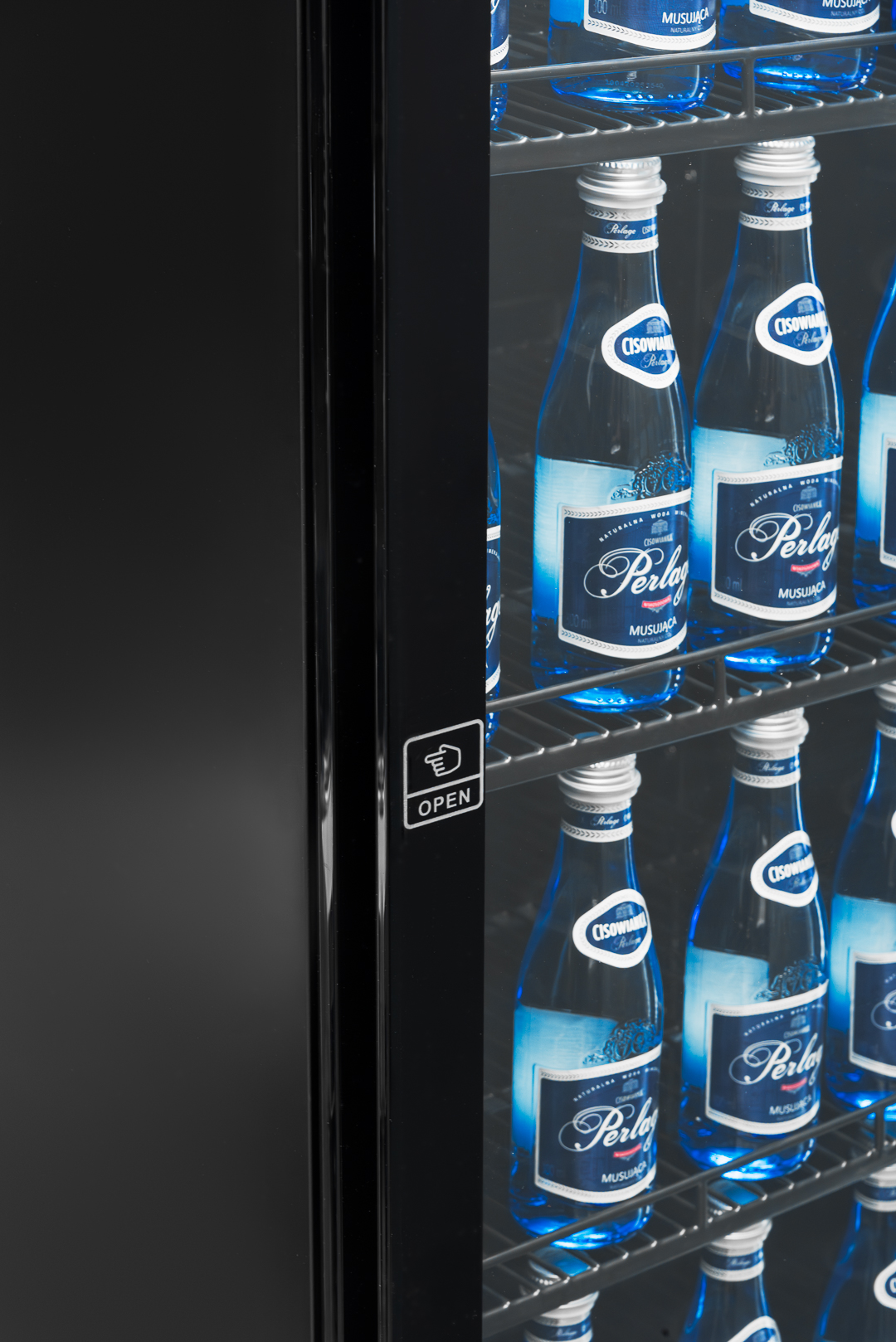- Innowacyjne oświetlenie LED zamontowane po prawej stronie drzwi oferuje funkcję zmiany barwy z białej na niebieską, co pozwala na błyskawiczne dopasowanie nastroju ekspozycji do wnętrza lokalu