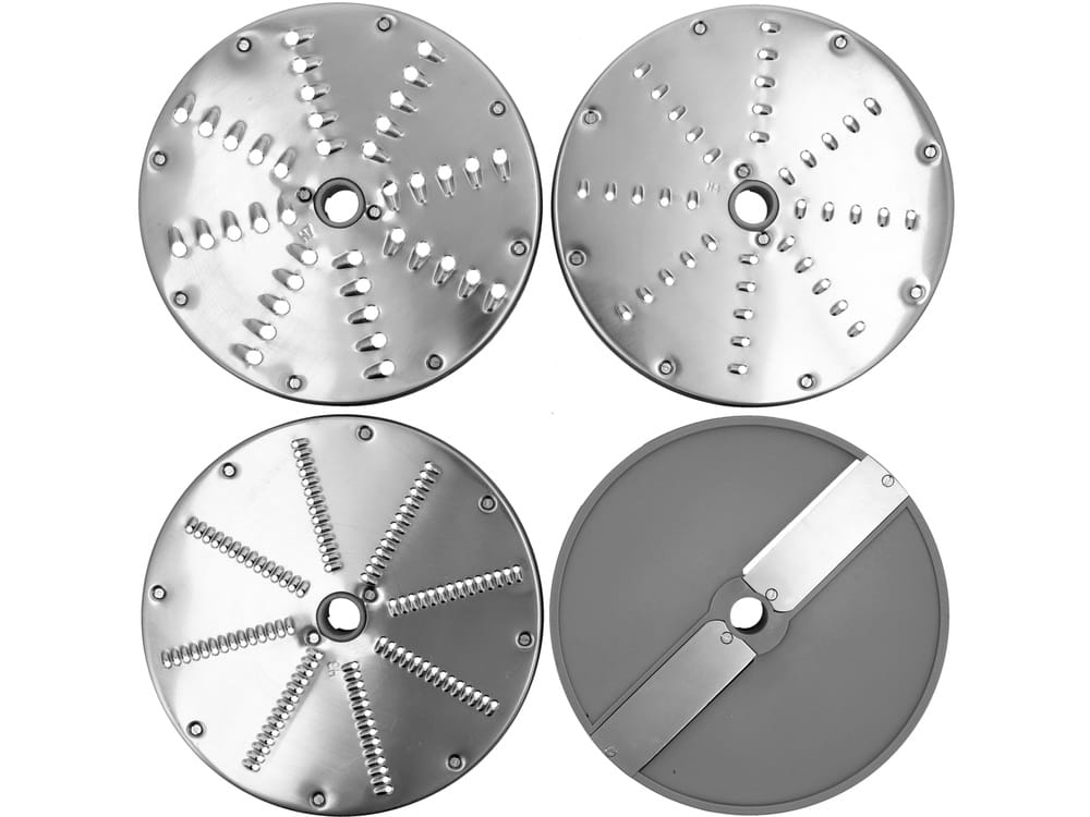 - W zestawie znajduje się 5 wymiennych tarcz tnących o średnicy 205 mm umożliwiających krojenie na: plastry 2 mm, plastry 4 mm, wiórki 3 mm, wiórki 5 mm, wiórki 7 mm
