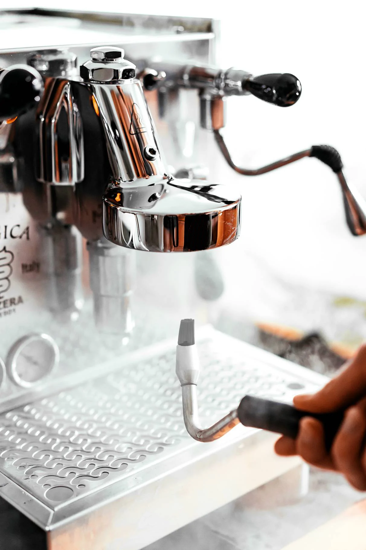 - Łączy się z rurką parową ekspresu do kawy i wykorzystuje moc pary oraz funkcję szczotki do czyszczenia głowic grupowych