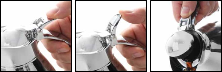 - Pokrywa, przycisk, dziobek i uchwyt z metalu chromowanego