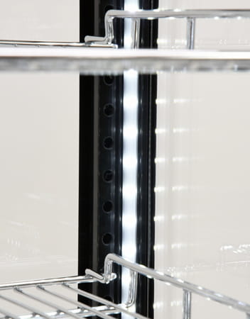 - Chłodzenie wymuszone gwarantuje równomierne rozprowadzenie powietrza wewnątrz całej witryny zapewniając równą temperaturę na każdej półce.