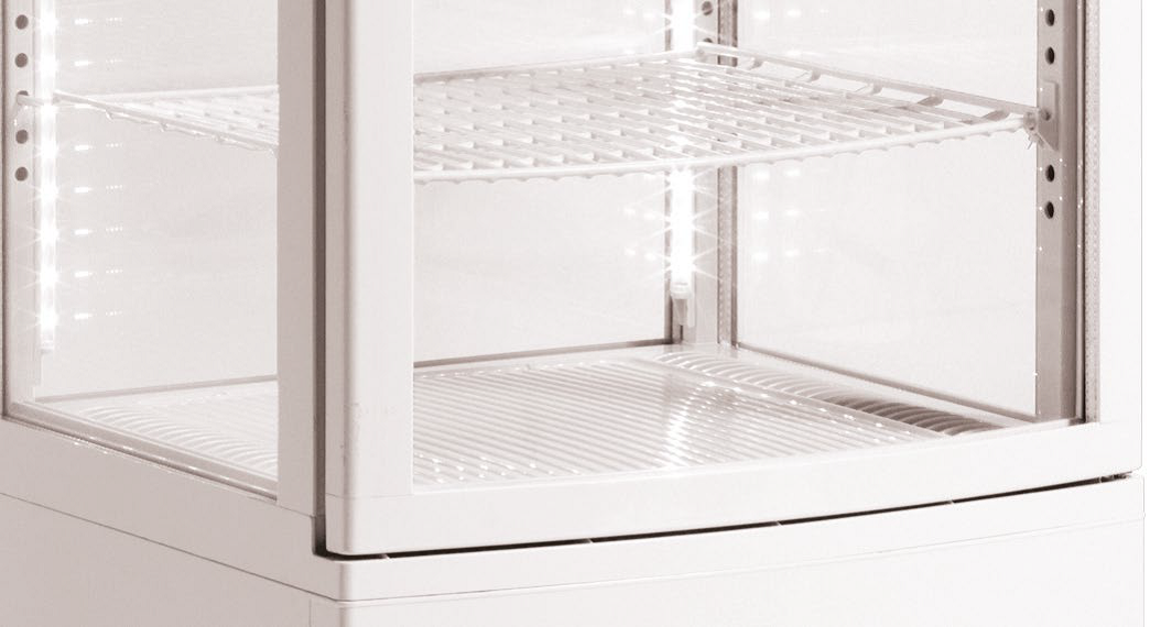 - Przeszklone ścianki witryny pozwalają na ekspozycję produktów z czterech stron