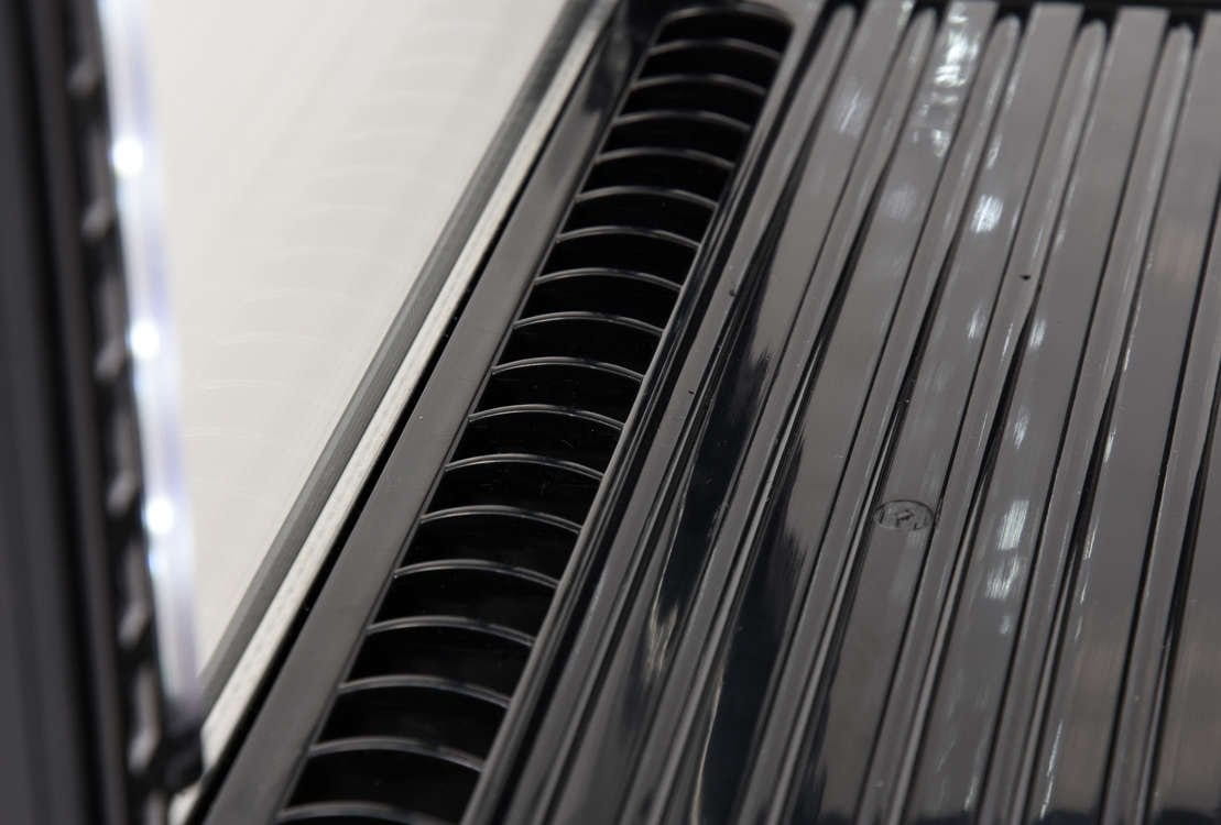 - Witryna chłodnicza ma pojemność 78L i posiada trzy wzmacniane i powlekane ochronnym PVC półki o regulowanej wysokości mocowania. Dostęp do nich odbywa się za pośrednictwem otwieranych drzwiczek szklanych. Wykonane są one z dwuwarstwowych szyb hartowanych, podobnie jak szyba frontowa i boczne. Zapewnia to dużą wytrzymałość, a jednocześnie bardzo dobre właściwości izolujące