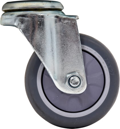 - Wózek wyposażony jest w 4 kółka z łożyskami, wykonane z wysokiej jakości szarego TPR. Zastosowanie twardego, a jednocześnie elastycznego materiału zapewnia bardzo cichą pracę. Kółka nie rysują posadzki, nie pozostawiają na niej śladów i są skrętne w zakresie 360°. Umożliwia to manewrowanie w trudno dostępnych pomieszczeniach i wąskich korytarzach. Dwa kółka wyposażono dodatkowo w hamulce.
